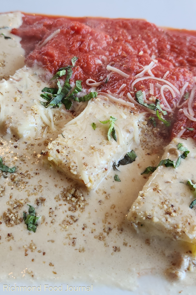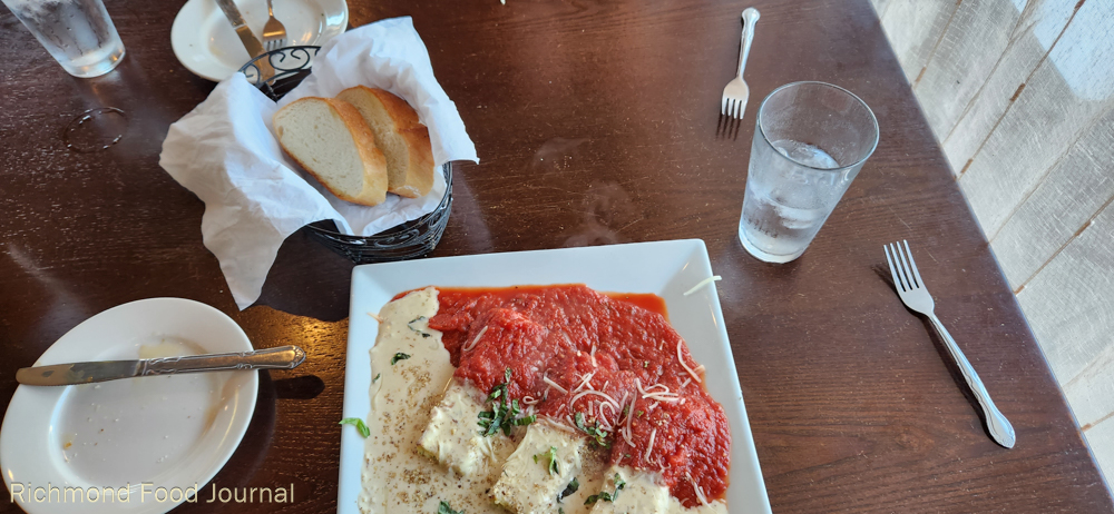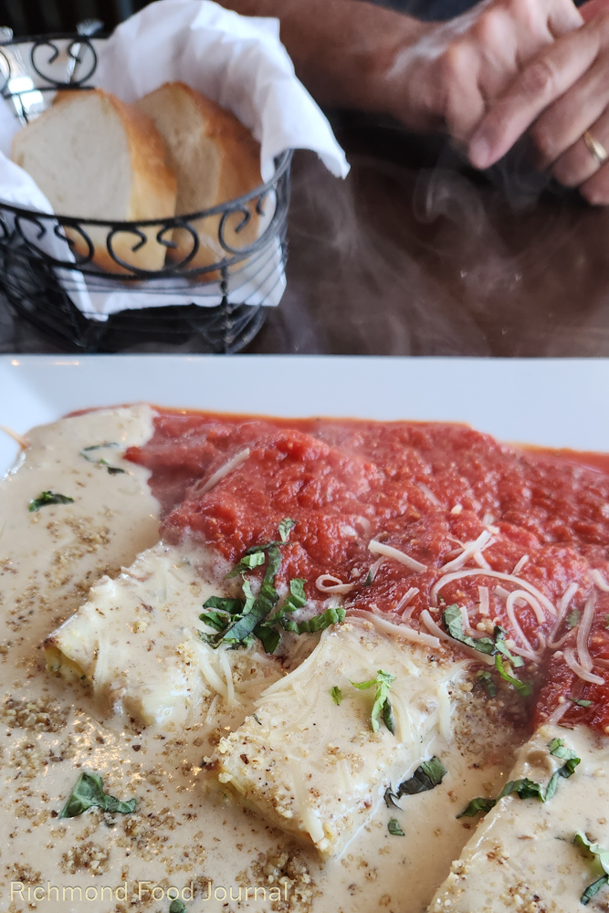 When the menus arrived and we were able to talk to the server, we settled on our meal choices. I remember mine was the manicotti with “half and half” – white walnut cheese sauce and red tomato sauce on my pasta. Very striking appearance!