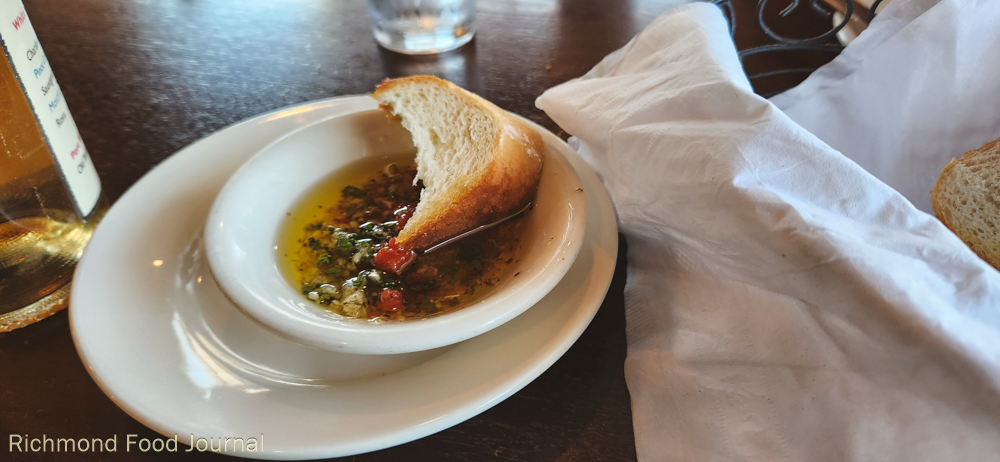 We walked inside and realized this is the kind of place that recommends making reservations. We shyly admitted to not having made any. The host assured us it would be fine and he led us to a table, where we did have to wait a bit before we received menus. I know this because I remember it hit me I have no idea the price range of this place, and here we were, sitting at a table, munching on bread and oil, kind of committed at this point.