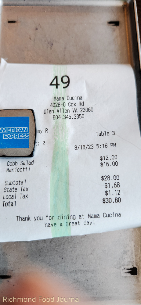 Mama Cucina is an Italian restaurant located in the West End of Richmond, tucked away in the community of Innsbrook. My husband and I discovered it accidentally, once again because we were starving and happened to be driving by. I’m more than a little amused to remember we found some of Richmond’s finest Italian cuisine because we pulled into the shopping center parking lot to get a hamburger at Dairy Queen.